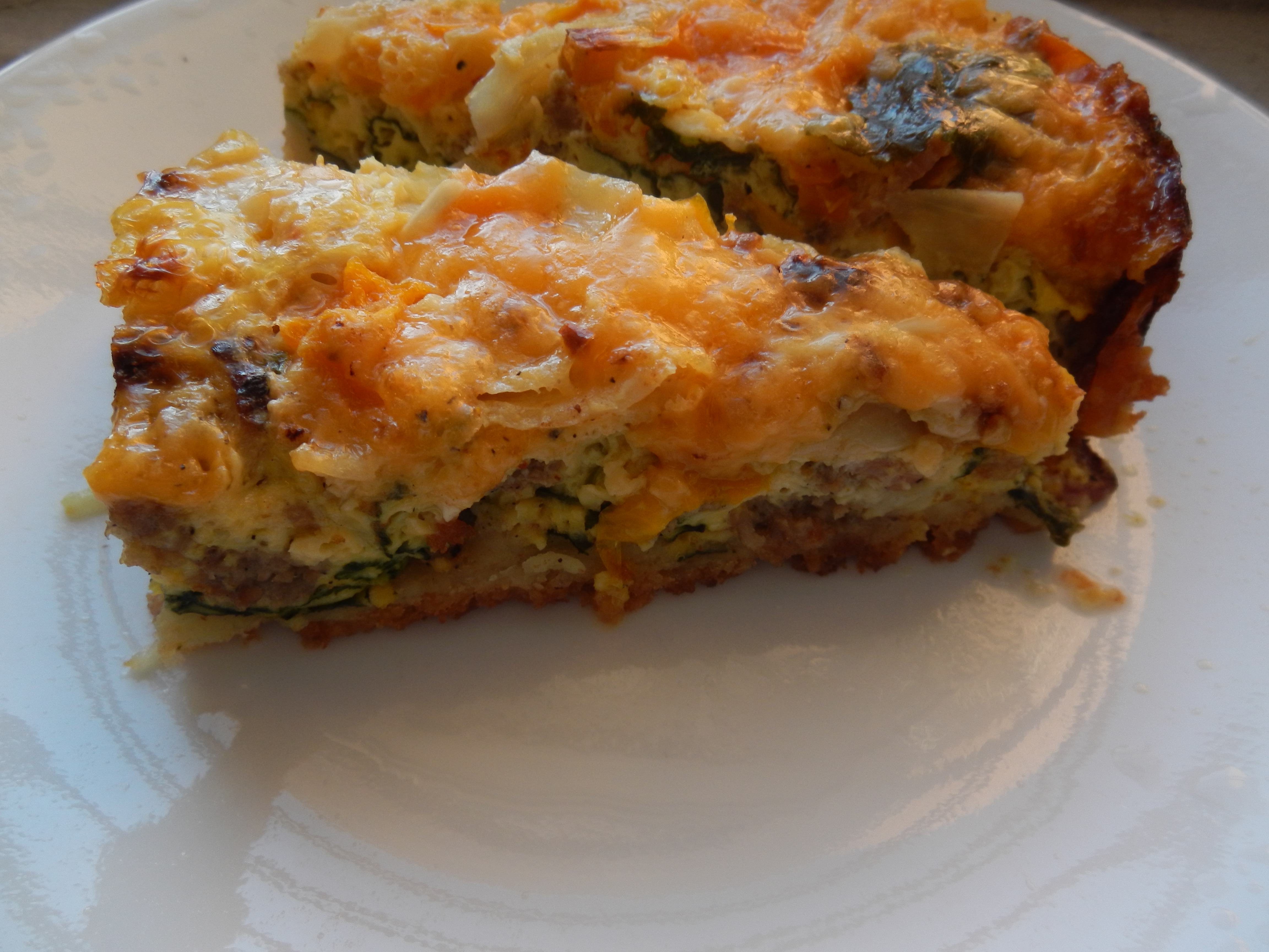 - Grease a deep round oven pan (or pyrex pan).Be sure to grease the side of the pan as well. Place the biscuit mix in the pan, making sure it is evenly distributed on the bottom on the pan. Line the biscuit mix with the spinach. Next, sprinkle the cooked pork and crumbled bacon on top. Add the onions, peppers, and some more spinach and then pour the egg mixture on top. Be sure that all the ingredients are evenly distributed in the pan.