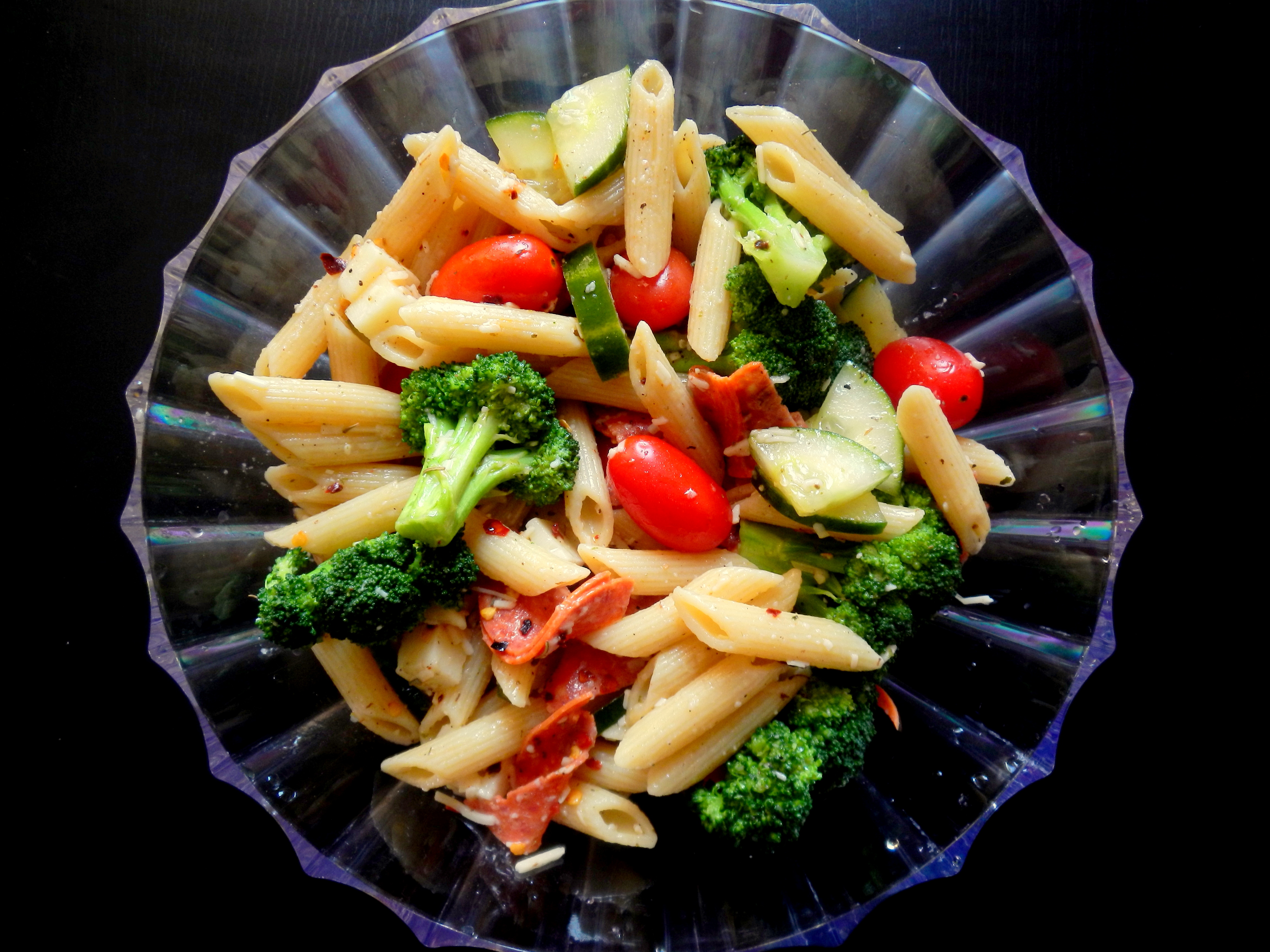 In that decision-making moment, we had a ‘ah-ha’ moment: A Primavera Pasta Salad! How could you go wrong with pasta, flavorful pepperoni, fresh cheese, juicy tomatoes, and crisp veggies, all tossed in a herb infused oil based dressing? And it could not be easier to make, did not take long to prepare, could be carried through a crowded, rough, or jerky 45 minute subway ride, tastes best at room temperature, is wallet-friendly, and tastes delicious. We had a winner!